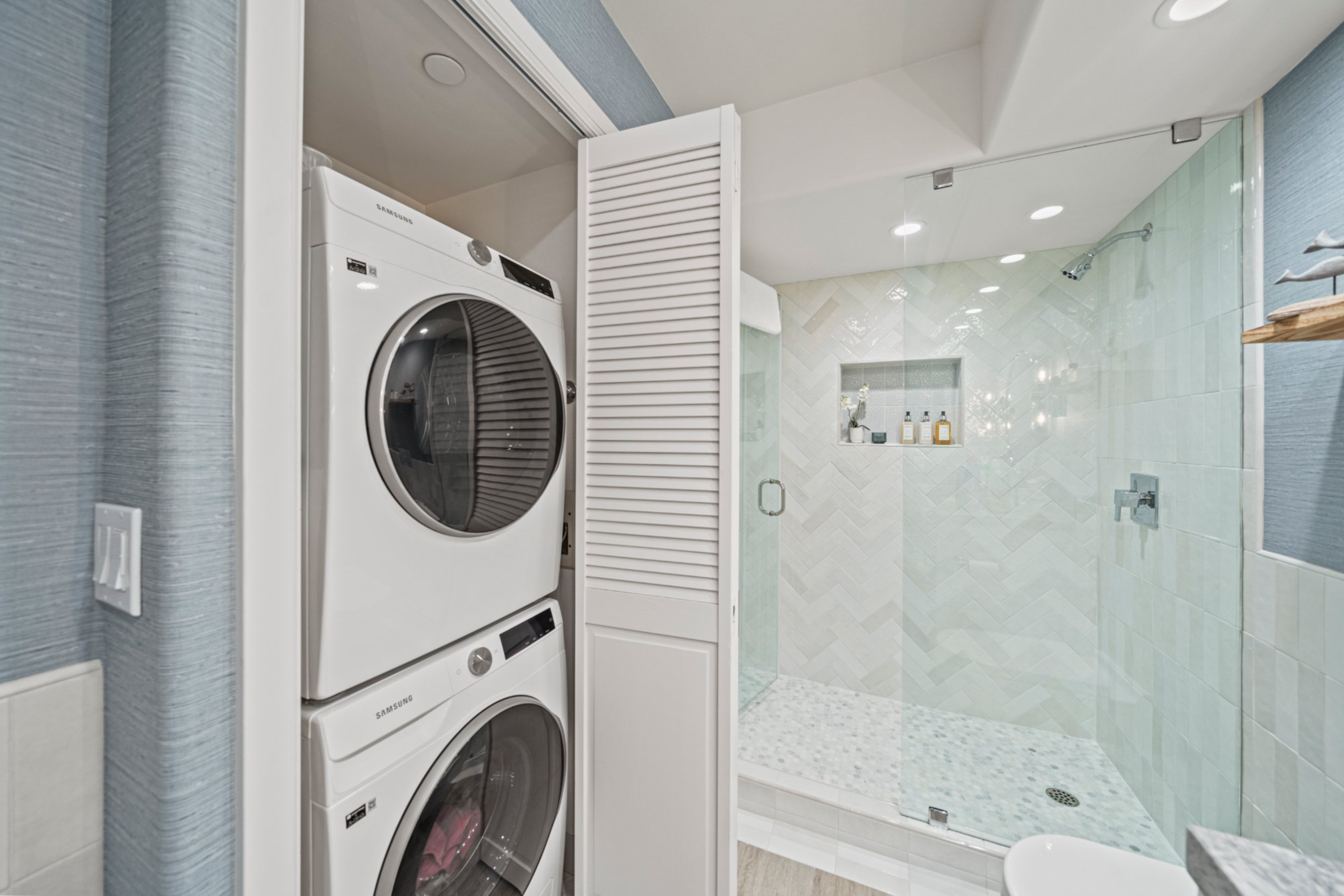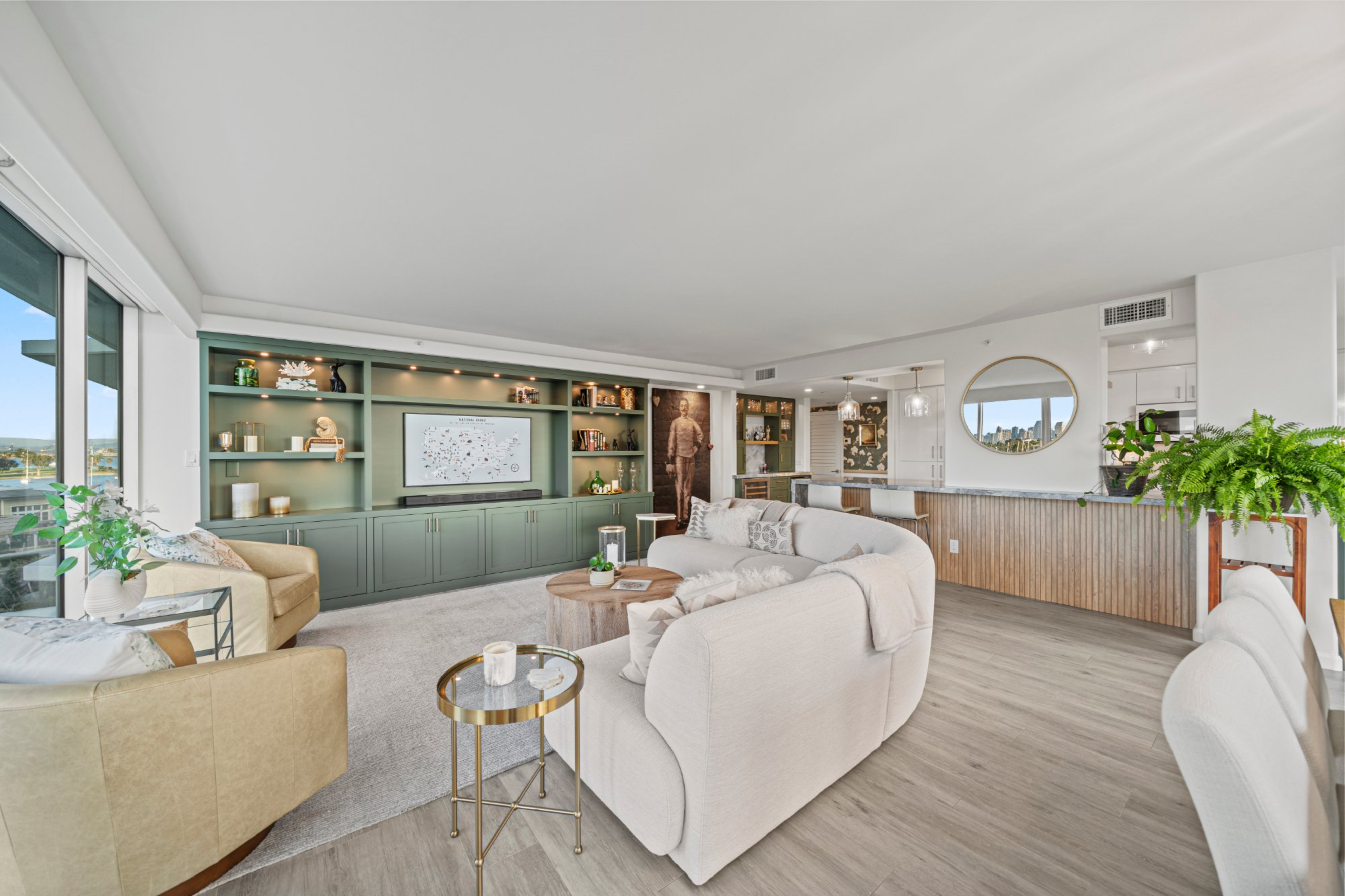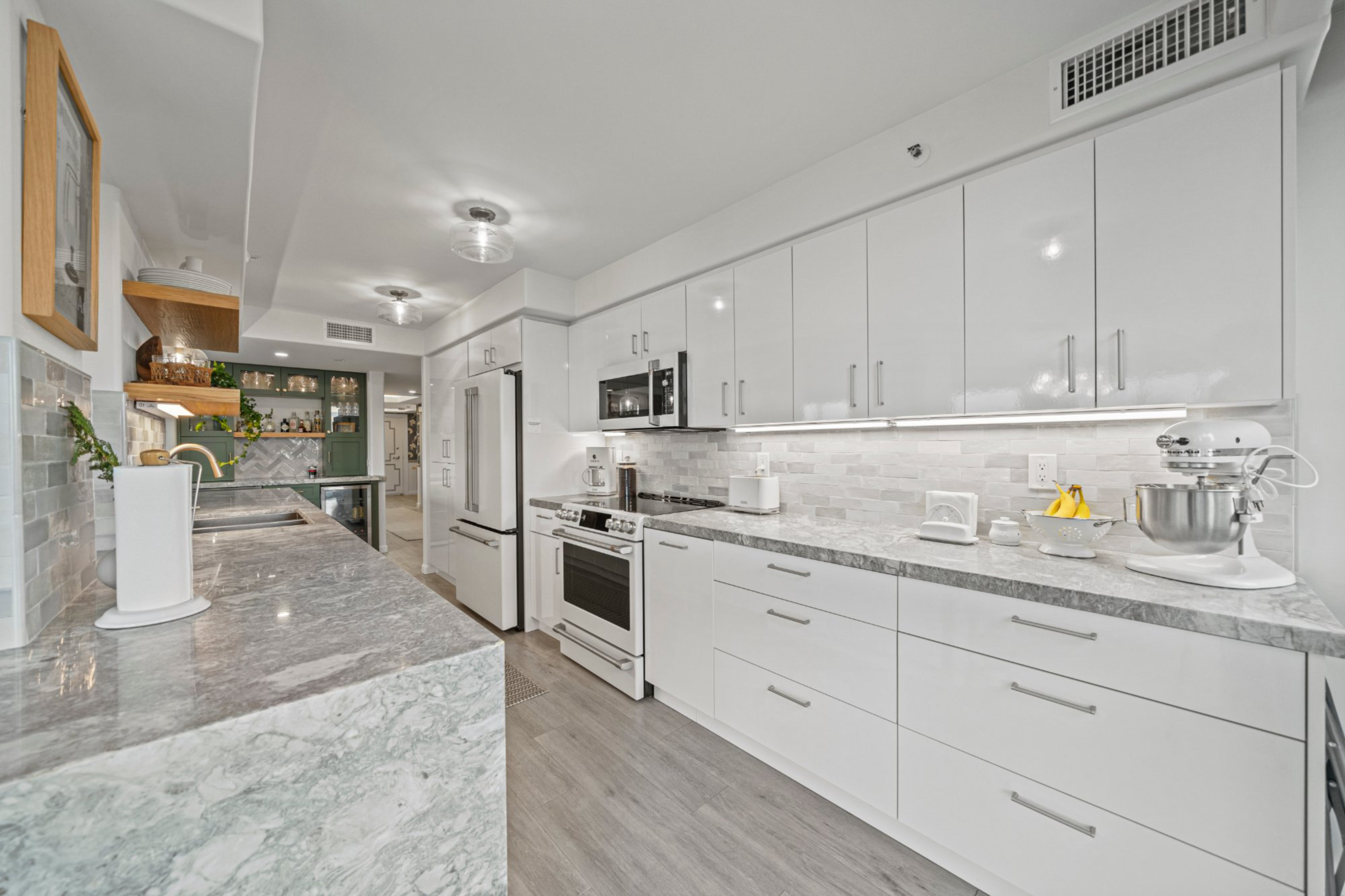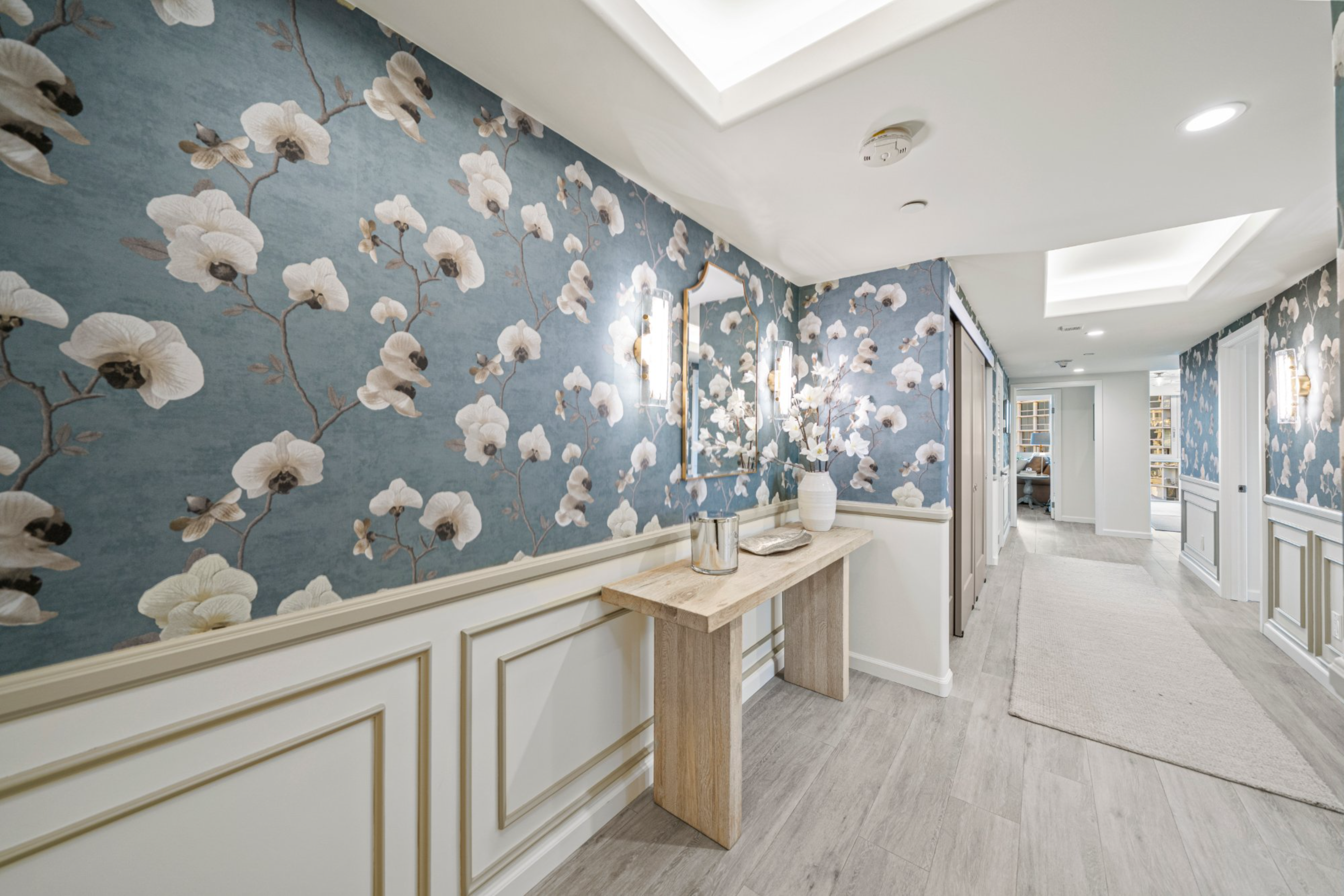 Offered fully furnished with high-end designer pieces, the interiors have been curated with exquisite craftsmanship and style. Highlights include hand-crafted woodwork in the living room and bar, custom trim in the hallway and primary suite, handmade tile in the kitchen and bathrooms, and designer wallpaper accents. The chef’s kitchen features all-new GE Café Signature Collection appliances, and the unit has new windows, automatic blinds, new interior doors and casings, upgraded lighting and sconces, and a new washer and dryer.